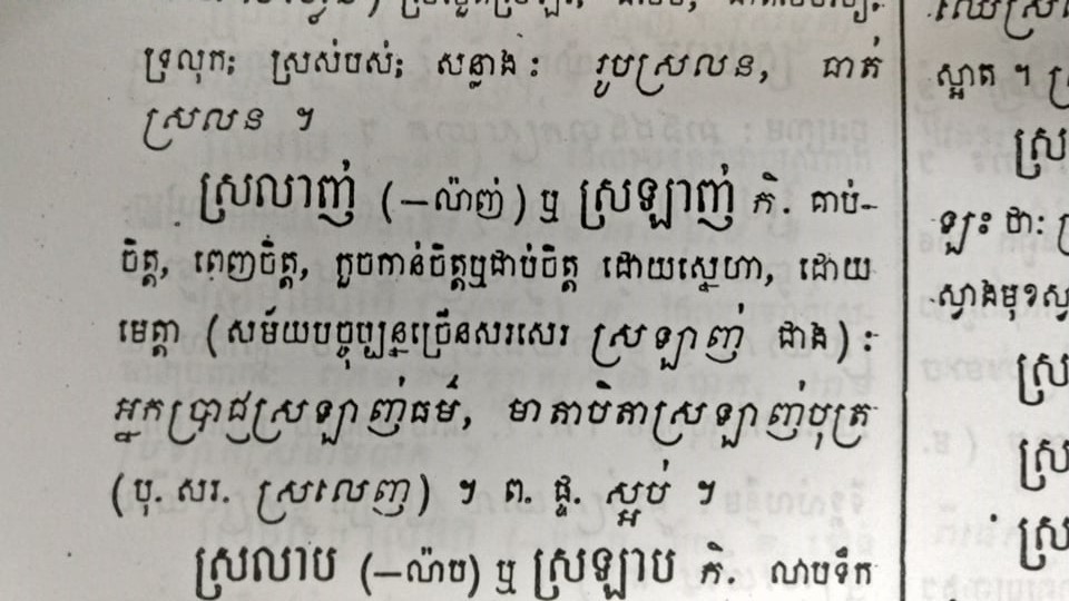 ហេតុផលទីមួយ ពេលបើកវចនានុក្រម នៅខាងចុងនៃពាក្យ «ស្រឡាញ់» មានបើកវង់ក្រចក និងសរសេរថា «ម.ព. ស្រលាញ់» ដែលមានន័យថា «មើលពាក្យ ស្រលាញ់»។ បើឃើញបែបនេះមានន័យថា «ស្រលាញ់» ដែលសរសេរនឹង «ល» ជាមេពាក្យ។