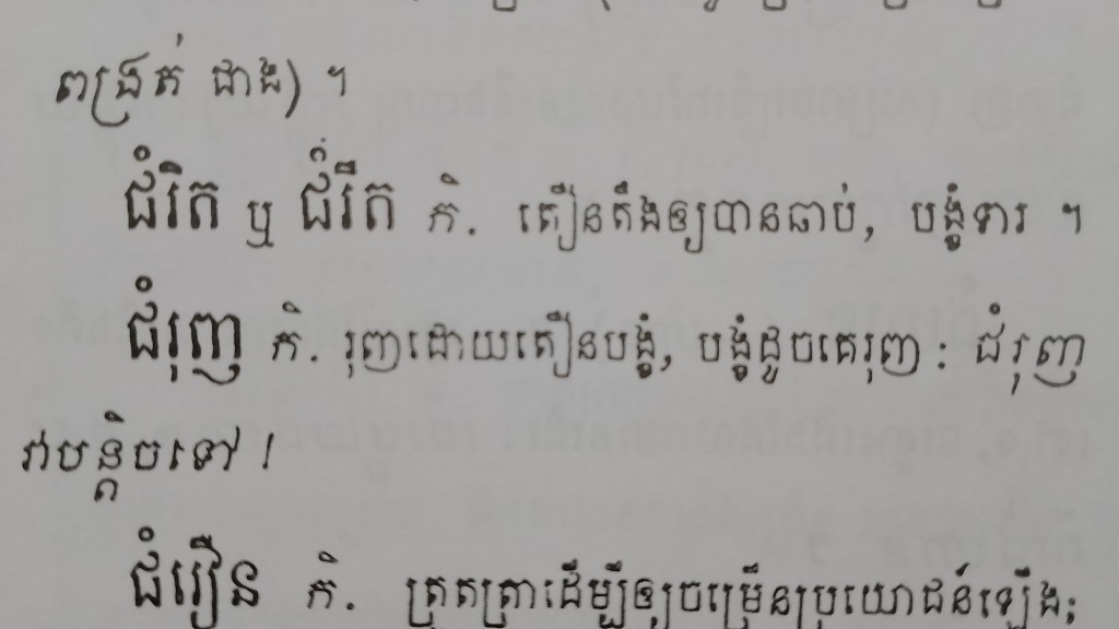 ដើមី្បឲ្យដឹងថា តើមួយណាត្រូវ រវាង «ជម្រុញ» និង «ជំរុញ»? ខ្ញុំក៏ចូលមើលសៀវភៅវចនានុក្រមពាក្យខ្មែរ ហើយក៏បានលទ្ធផលដូចក្នុងរូបខាងក្រោម។